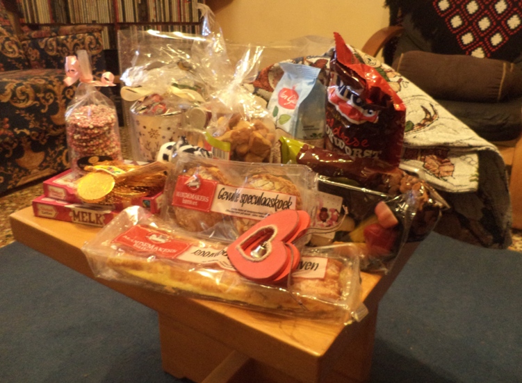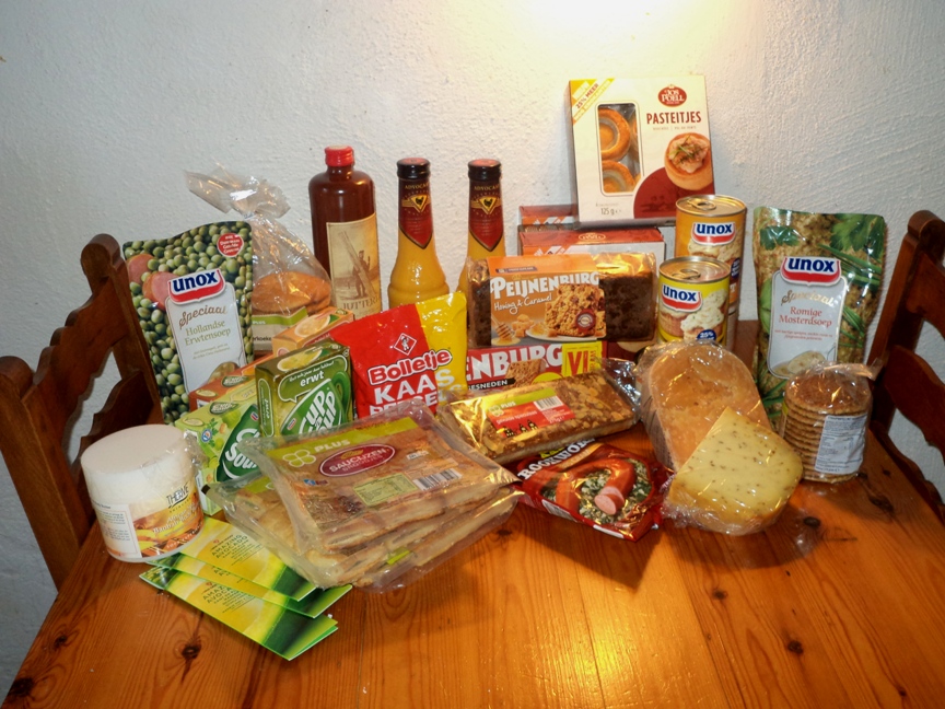 Holland.home.pakketNog veel meer Nederlandse lekkernijen hebben de afgelopen tijd mijn tong gestreeld. Mijn Moeder Annie-column uit 2008 won namelijk de hoofdprijs in een schrijfwedstrijd van de FB-groep Nederlanders-in-het-Buitenland. Ik mocht een ruime keuze maken uit het assortiment van de online-supermarkt Holland@Home en dat leverde een pakket nostalgie op waar ik een hele grote stralende glimlach van kreeg. Als mensen mij vragen wat ik op voedselgebied mis uit Nederland, kan ik met de hand op mijn hart verklaren dat ik op dat gebied eigenlijk niets echt mis. Maar een saucijzenbroodje of een lekker pasteitje is heel aantrekkelijk als je dat jaren niet hebt gegeten. Ontbijtkoek, eierkoeken, erwtensoep… het zat allemaal in het pakket. Net als twee hele grote stukken oude brokkelkaas en komijnekaas. Daar waren we vóór de foto al aan begonnen. Ach ja, we zijn en blijven nu eenmaal echte kaaskoppen.
