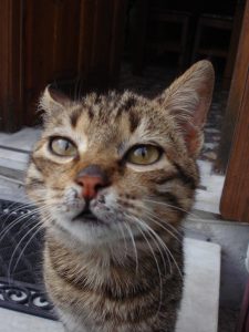 Op de derde dag in ons nieuwe huis ‘moest’ manlief tegen het eind van de middag ineens heel nodig voor een boodschap naar Kala Nera. Het was al donker toen ik zijn brommer weer hoorde – en nog iets anders: een zeer bekend gemiauw dat uit de boodschappentas in het kratje kwam. ‘Ik kon hem niet weer achterlaten,’ bekende manlief een beetje schaapachtig toen het vrolijke koppie van Jurgen tevoorschijn kwam. ‘Ik ging even langs om te kijken hoe het met hem was. Hij kwam meteen aanrennen toen hij de brommer hoorde, en hij kroop zowat in me, zo blij was hij om me weer te zien.’ De uren en dagen erna was Jurgen niet bij ons weg te slaan. Hij wilde maar gekroeld en aangehaald worden, sprong op mijn verzoek ogenblikkelijk op de kattenbak om zijn behoefte te doen – wat hem een uitbundig prijzen van ons opleverde – en was met geen stok de deur uit te krijgen al stond die wagenwijd open. Het was werkelijk hartverwarmend om te zien hoe hij zijn best deed om het ons naar de zin te maken, bang als hij blijkbaar was om weer weggestuurd te worden. Weken later, toen hij allang overdag samen met Leopold buiten rondstruinde, kwam hij nog steeds naar binnen rennen om zijn behoefte op de kattenbak te doen. Dat was immers waar hij ons in die eerste dagen zo’n plezier mee had gedaan, nietwaar? En Jurgen wilde ons dat plezier niet ontnemen. Stel je voor dat we hem weer weg zouden doen…
